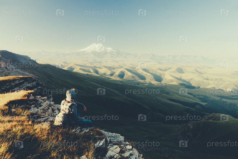 Путешественник, глядя на гору Эльбрус