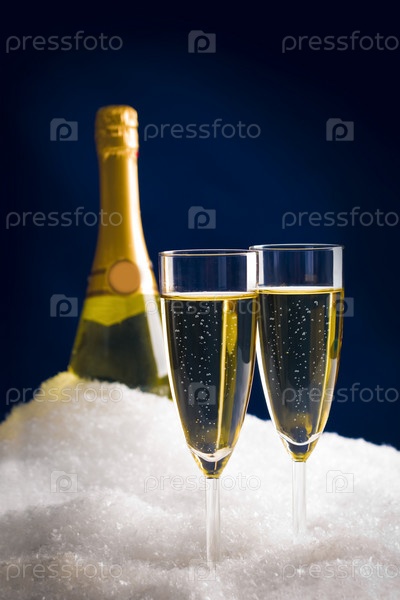 Вертикальная фотография двух шампанских с бутылкой на фоне в снегу