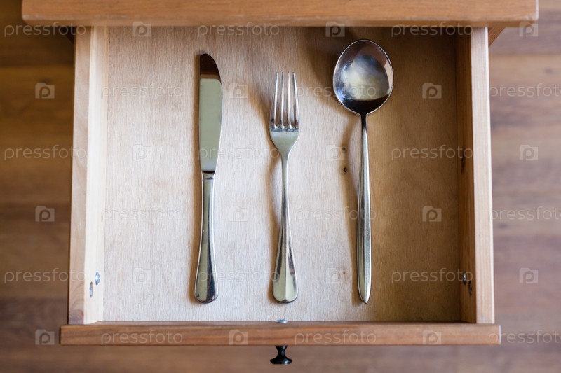 Столовый нож, вилка, ложка в ящике