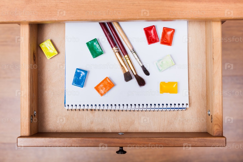 Кисти и акварельные краски в ящике