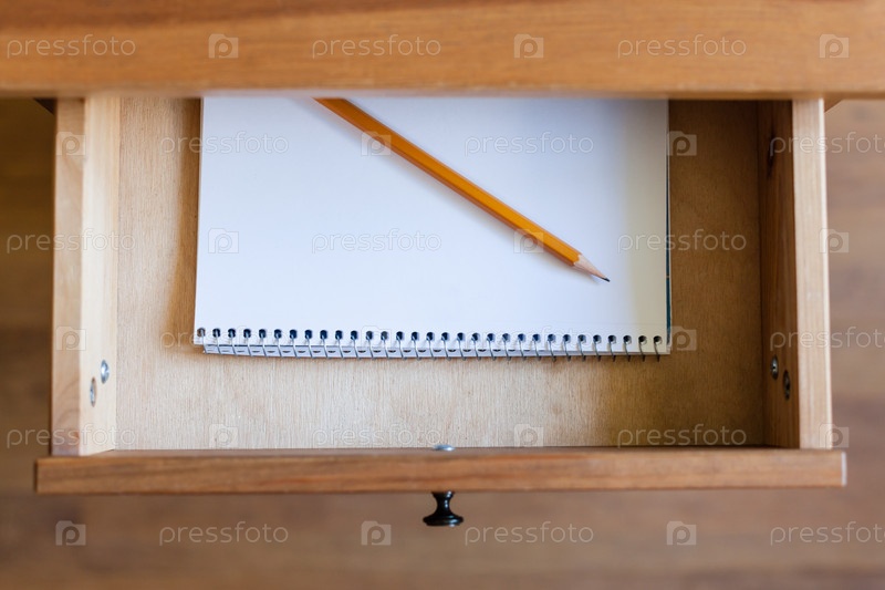 Карандаш и альбом для рисования в ящике стола
