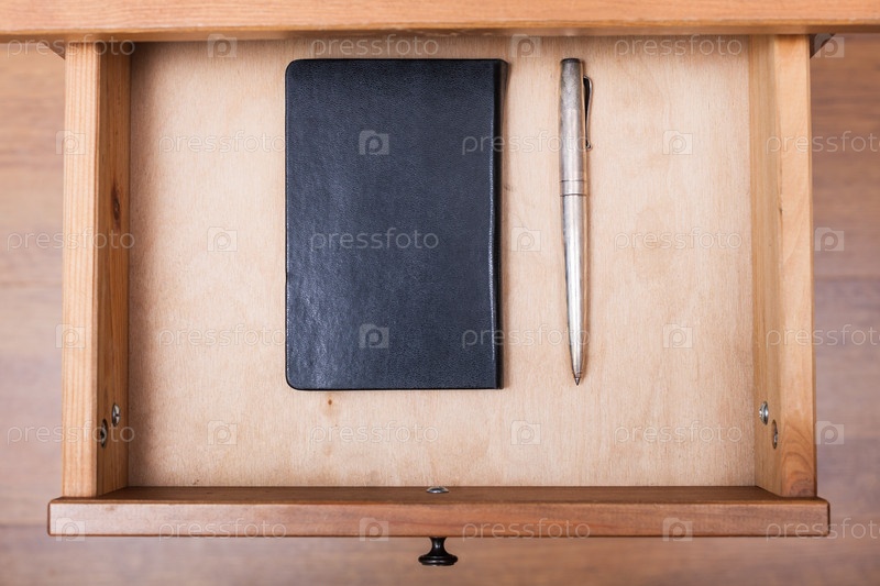 Ручка и черный блокнот в ящике стола