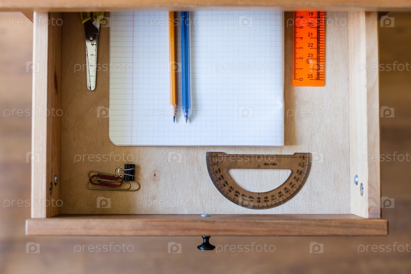 Канцелярские товары в ящике стола