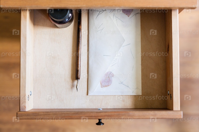 Перо, тушь и конверт в ящике стола