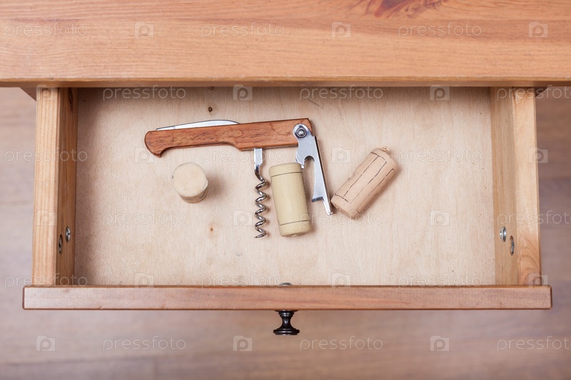 Складной штопор и пробка в ящике стола