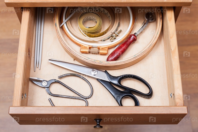 Аксессуары для рукоделия в ящике стола