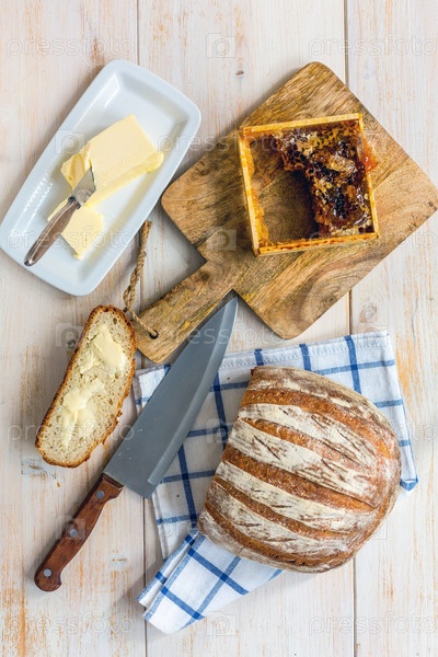 Свежий домашний хлеб, масло и мед в сотах