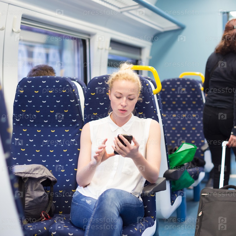 Женщина с мобильным телефоном в поезде