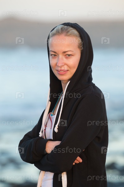 Женщина на песчаном пляже в сумерках