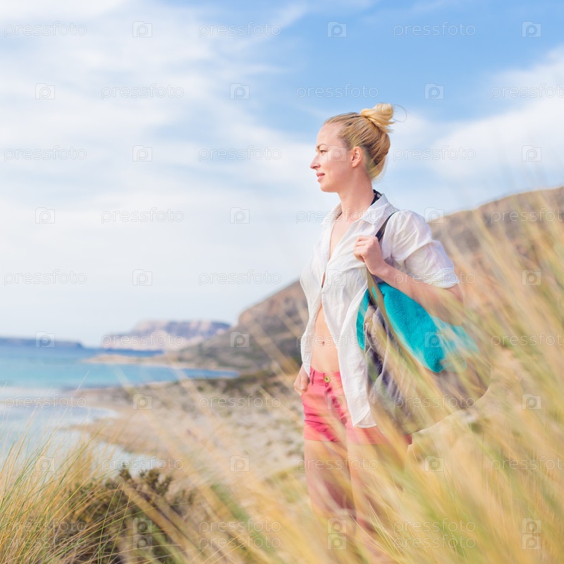 Счастливая женщина, наслаждаясь солнцем на каникулах