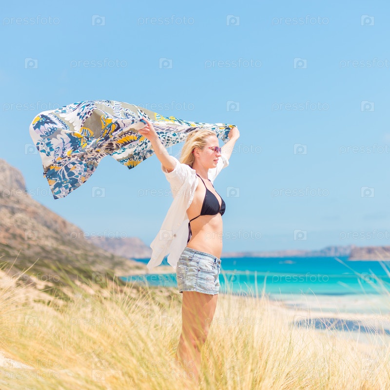 Счастливая женщина, наслаждаясь солнцем на каникулах