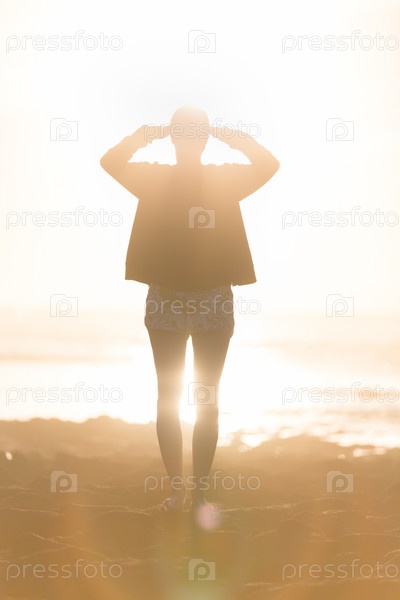 Женщина на песчаном пляже, наблюдая закат