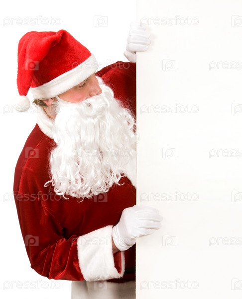 Фото счастливого Санта-Клауса, который смотрит на пустую доску