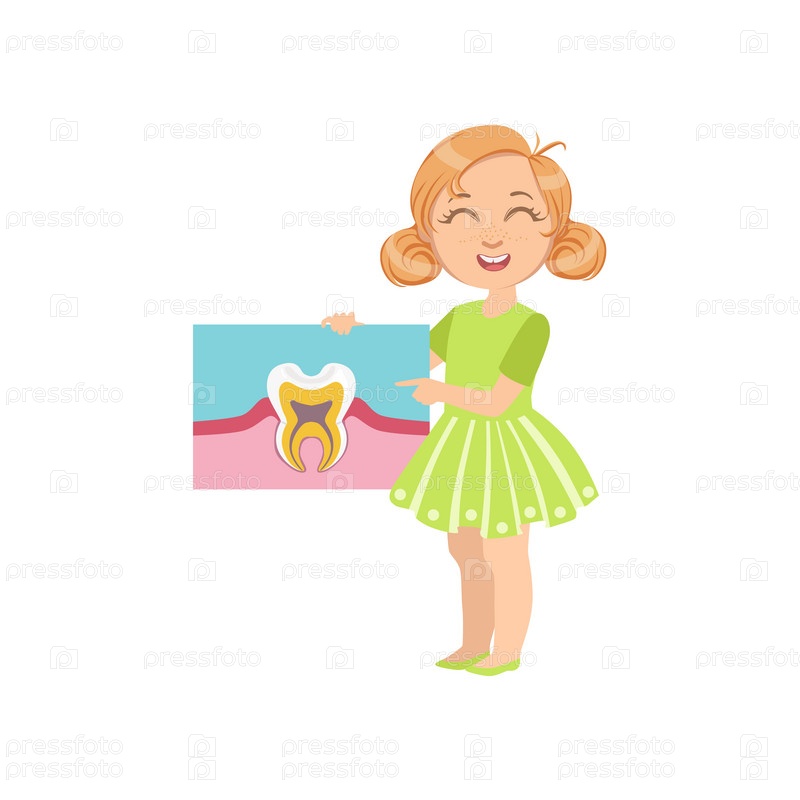 Девочка с плакатом анатомии зуба