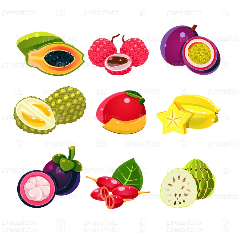 Набор красочных экзотических тропических фруктов