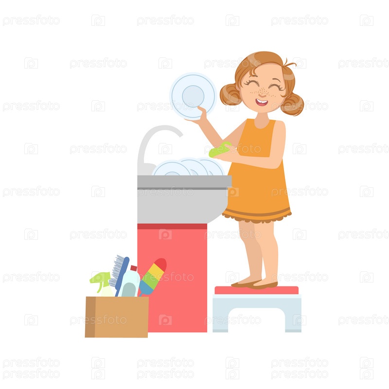 Девочка моет посуду