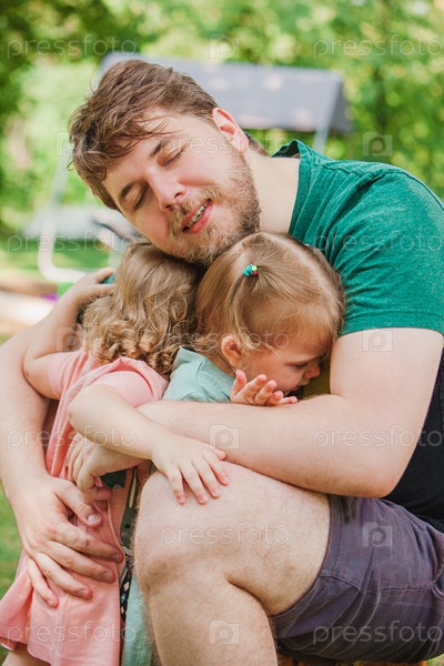 Отец обнимает дочек