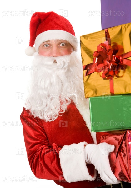 Фото счастливого Санта-Клауса с несколькими коробками подарков в руках