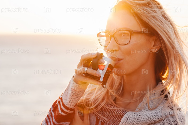 Девушка с чашечкой чая на побережье