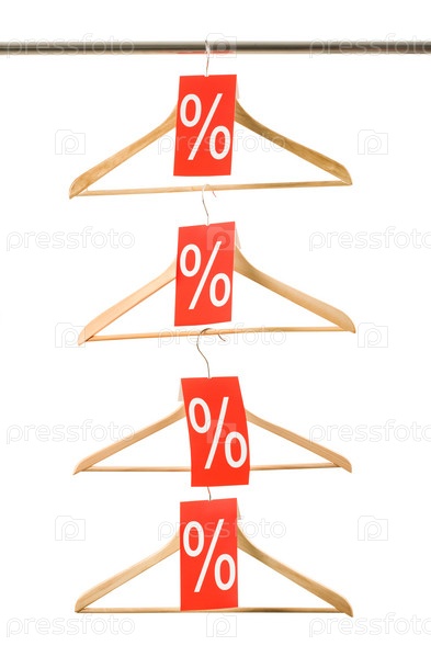 Изображение деревянных вешалок с распродажей скидка красные чеки на белом фоне
