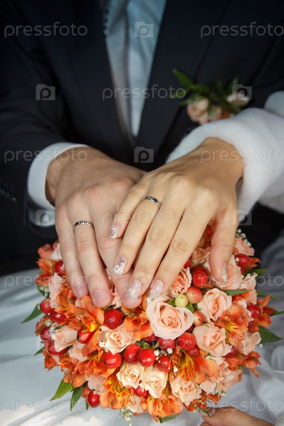 Руки молодоженов на свадебном букете