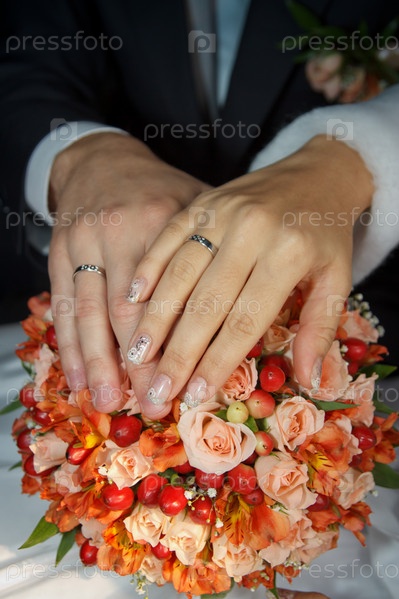 Руки молодоженов на свадебном букете