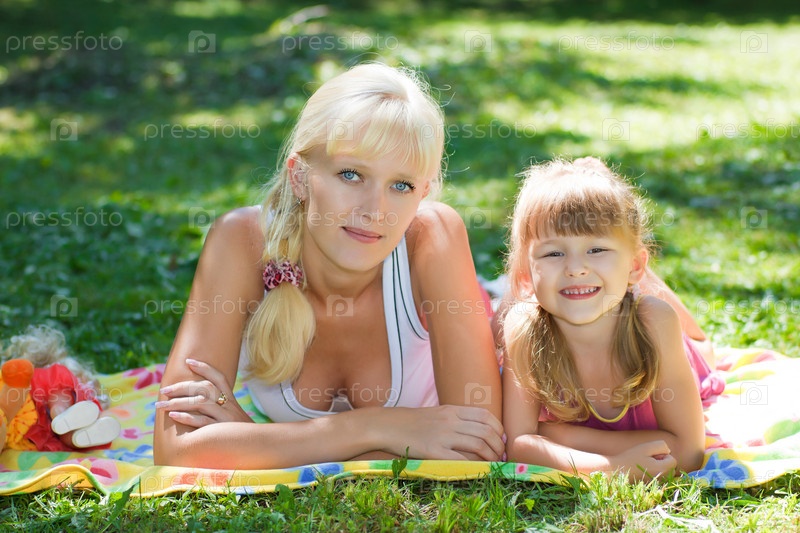 Портрет молодой матери с дочерью на отдыхе в парке