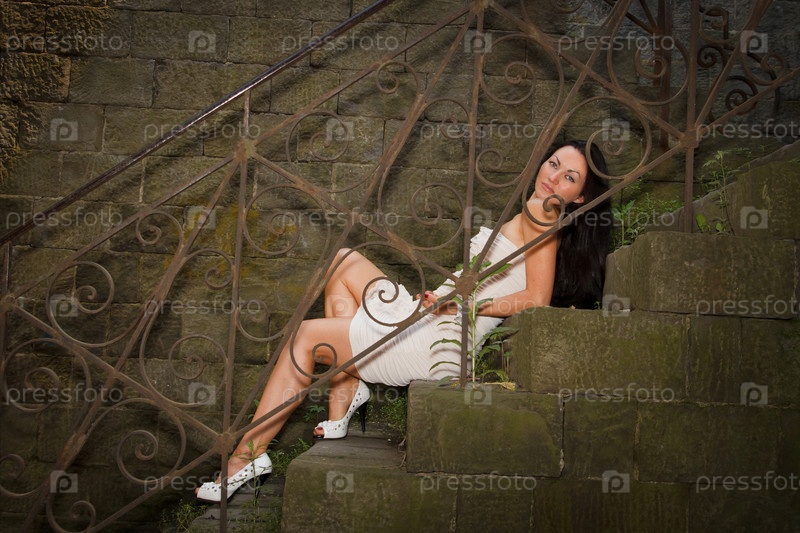 Симпатичная девушка с длинными волосами, сидящая на лестнице