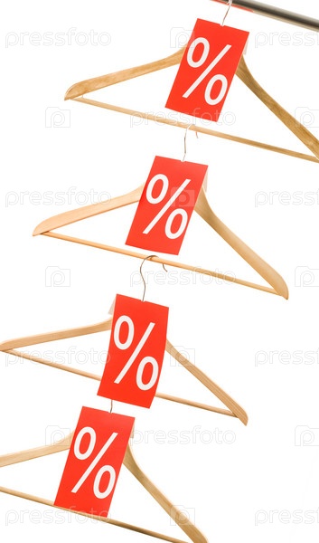 Изображение деревянных вешалок с распродажей скидка красные чеки на белом фоне