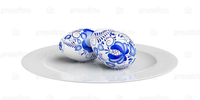 Два пасхальных яйца на тарелке на белом фоне