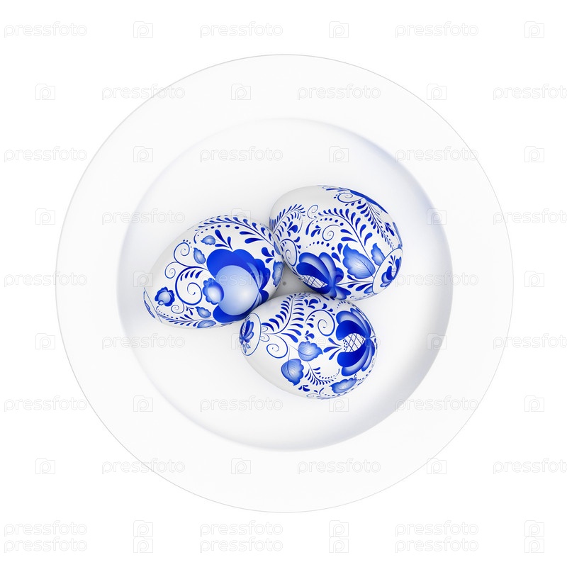 Три пасхальных яйца на тарелке на белом фоне