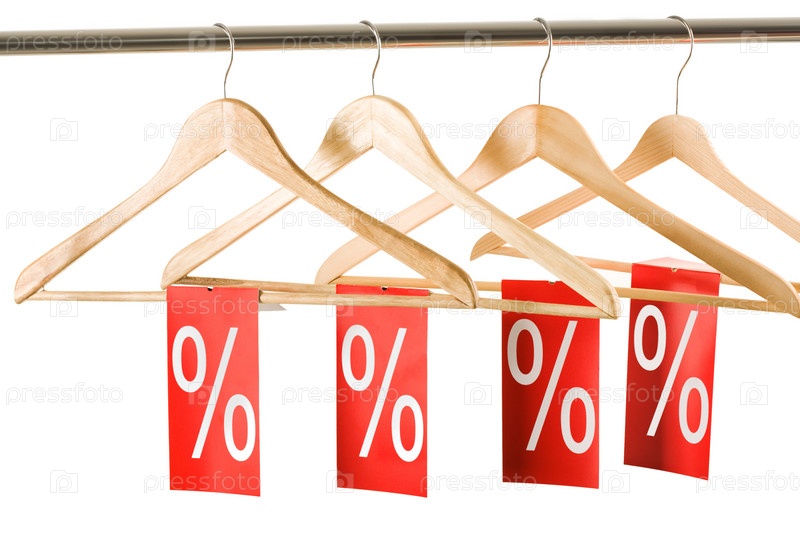 Фото вешалок с красными этикетками, на которых показаны праздничные скидки и продажи
