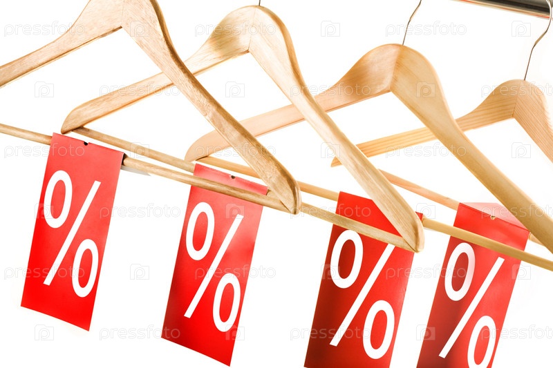 Фото вешалок с красными этикетками, показывающих скидку на праздники