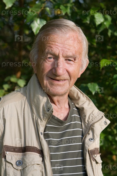 Портрет седой пожилой мужчины в синей рубашке летом в деревне на природе