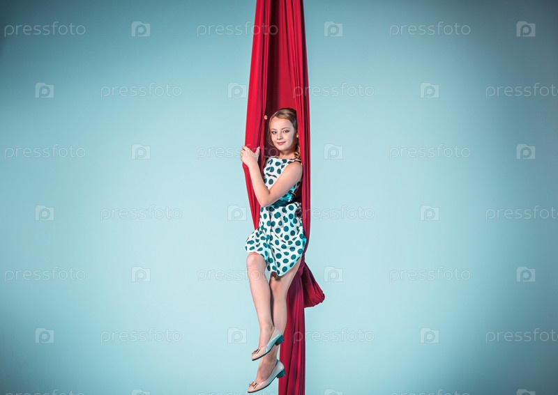 Изящная гимнастка, сидя на красной ткани