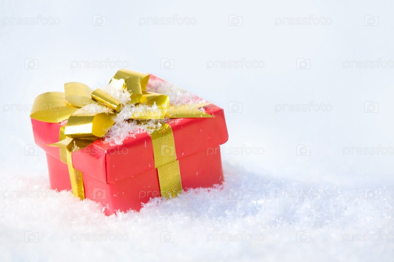 Близкий план красной подарочной коробки, украшенной луком из золотой ленты