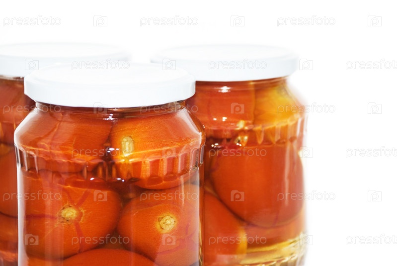 Соленые помидоры в банках на белом фоне