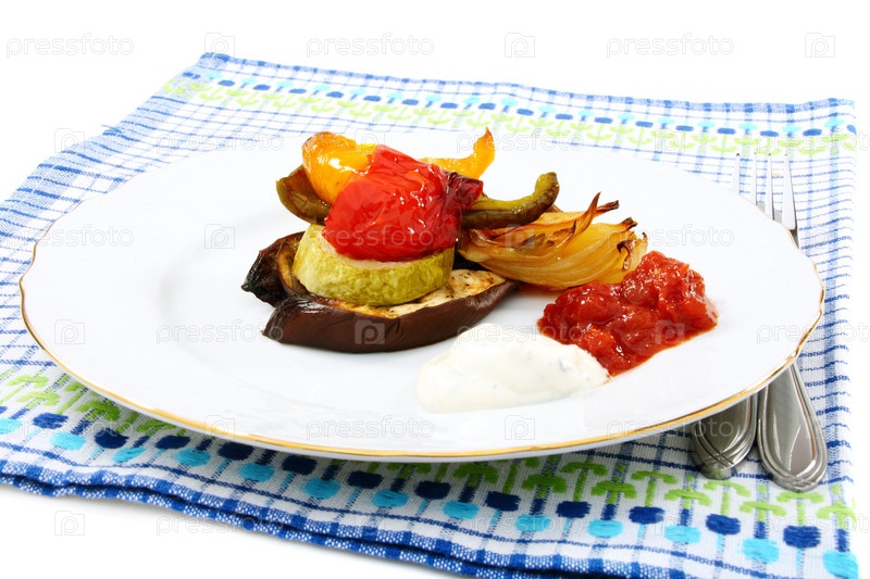 Обжаренные овощи с йогуртом и томатным соус на голубой скатерти