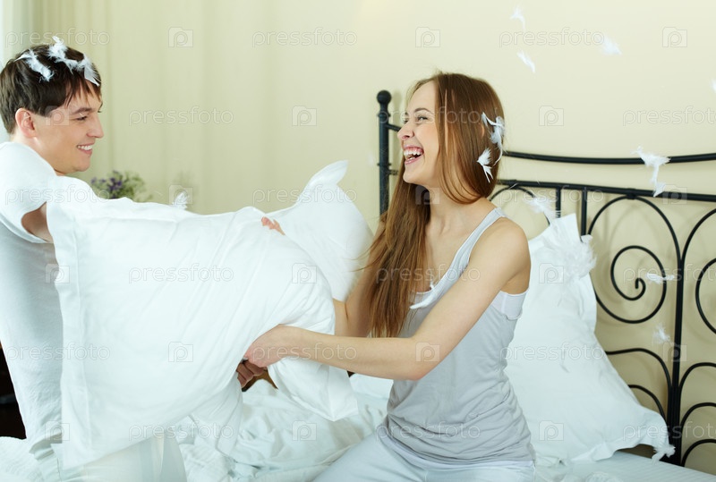 Молодая пара играет с подушками в постели утром