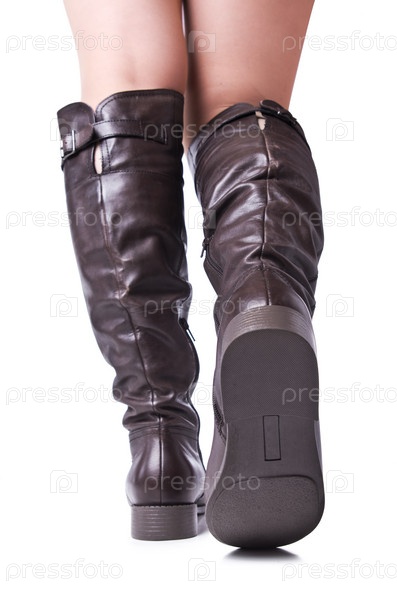 Женские ноги в кожаных сапогах на белом фоне