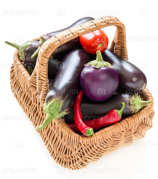 Баклажаны, помидоры и острый перец в корзине