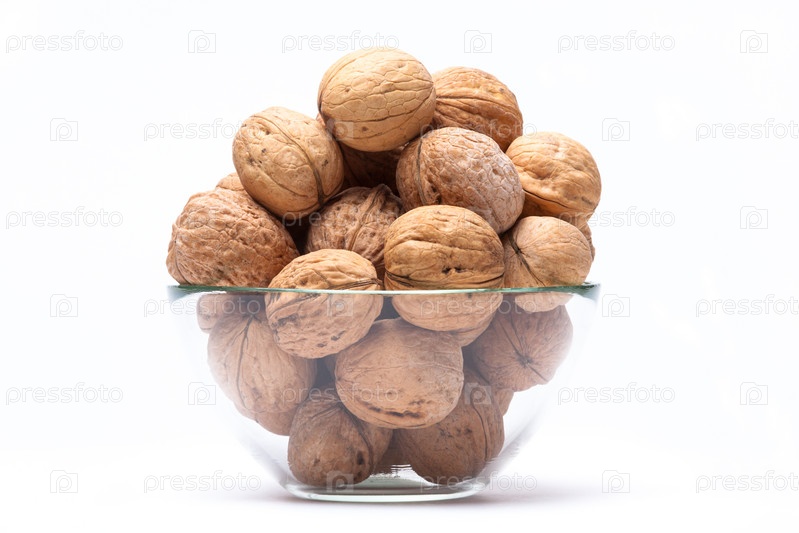 Грецкие орехи в стеклянной миске на белом фоне