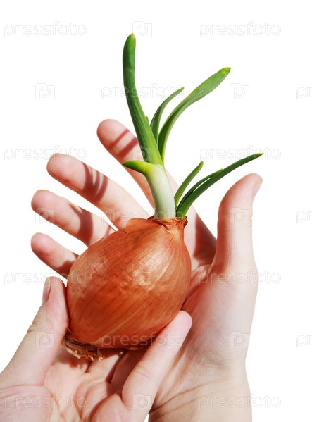 Проросший репчатый лук в руках на белом фоне