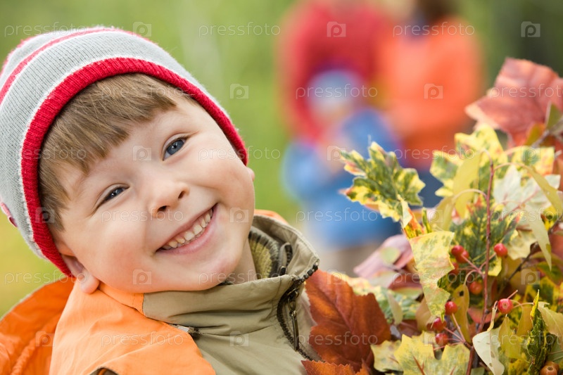 Улыбающийся мальчик с осенними листьями