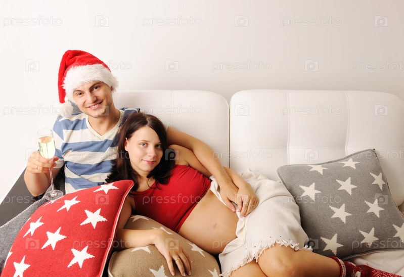 Счастливые муж и жена, ожидающие ребенка на диване