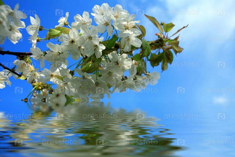 Цветущая ветка с белыми цветами на фоне голубого неба над водой