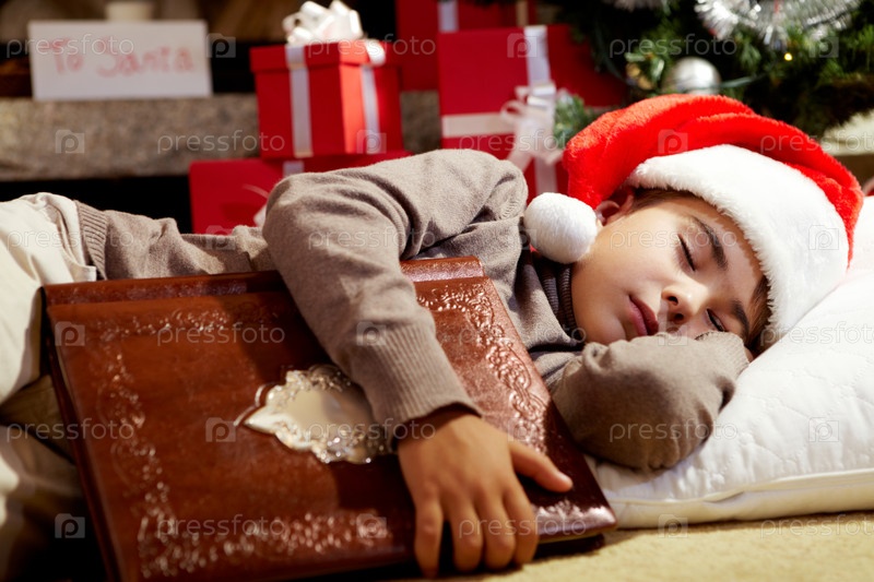 Спящий мальчик с рождественской книгой