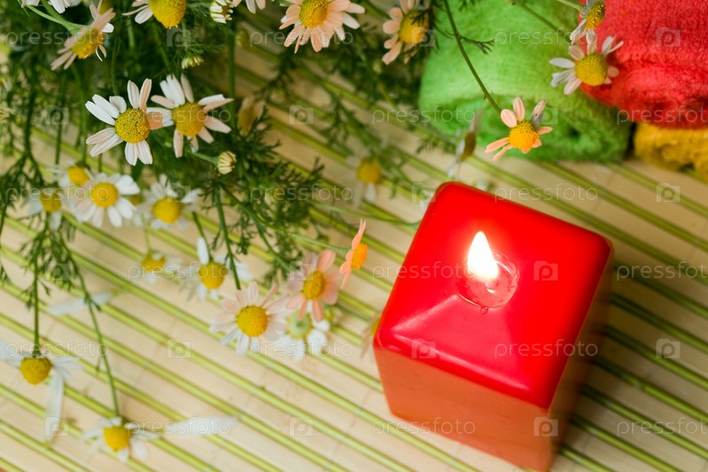 Горящая свеча и полотенца для СПА процедур с цветами ромашки на бамбуковой салфетке