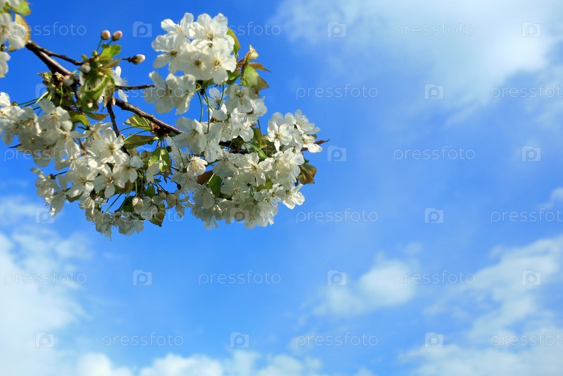 Ветка с белыми цветами на фоне голубого неба