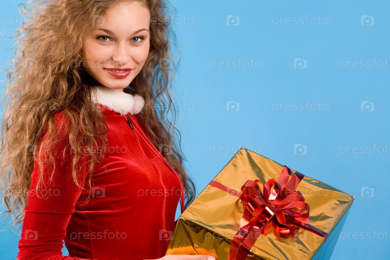 Портрет красивой улыбающейся девушки с коробкой подарков на синем фоне
